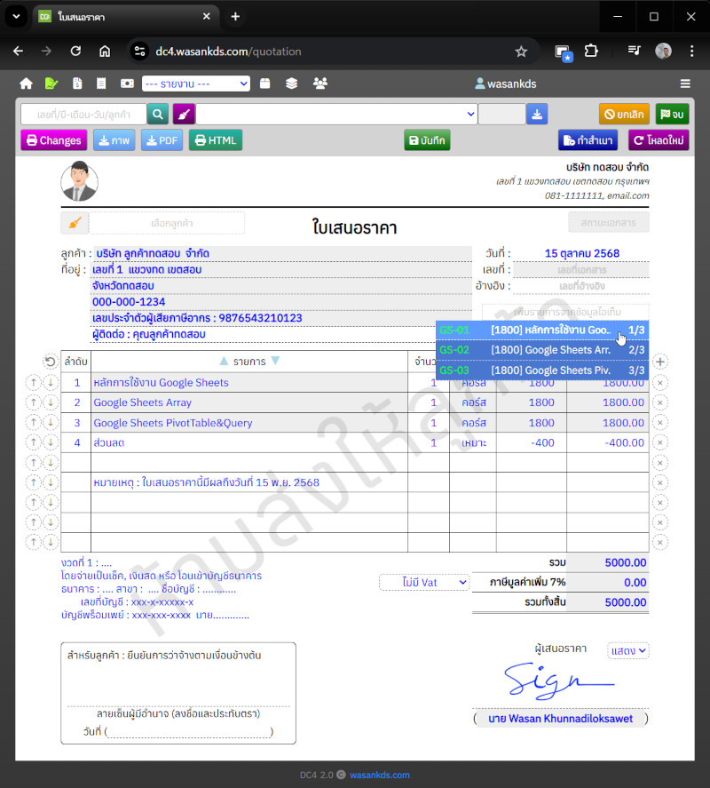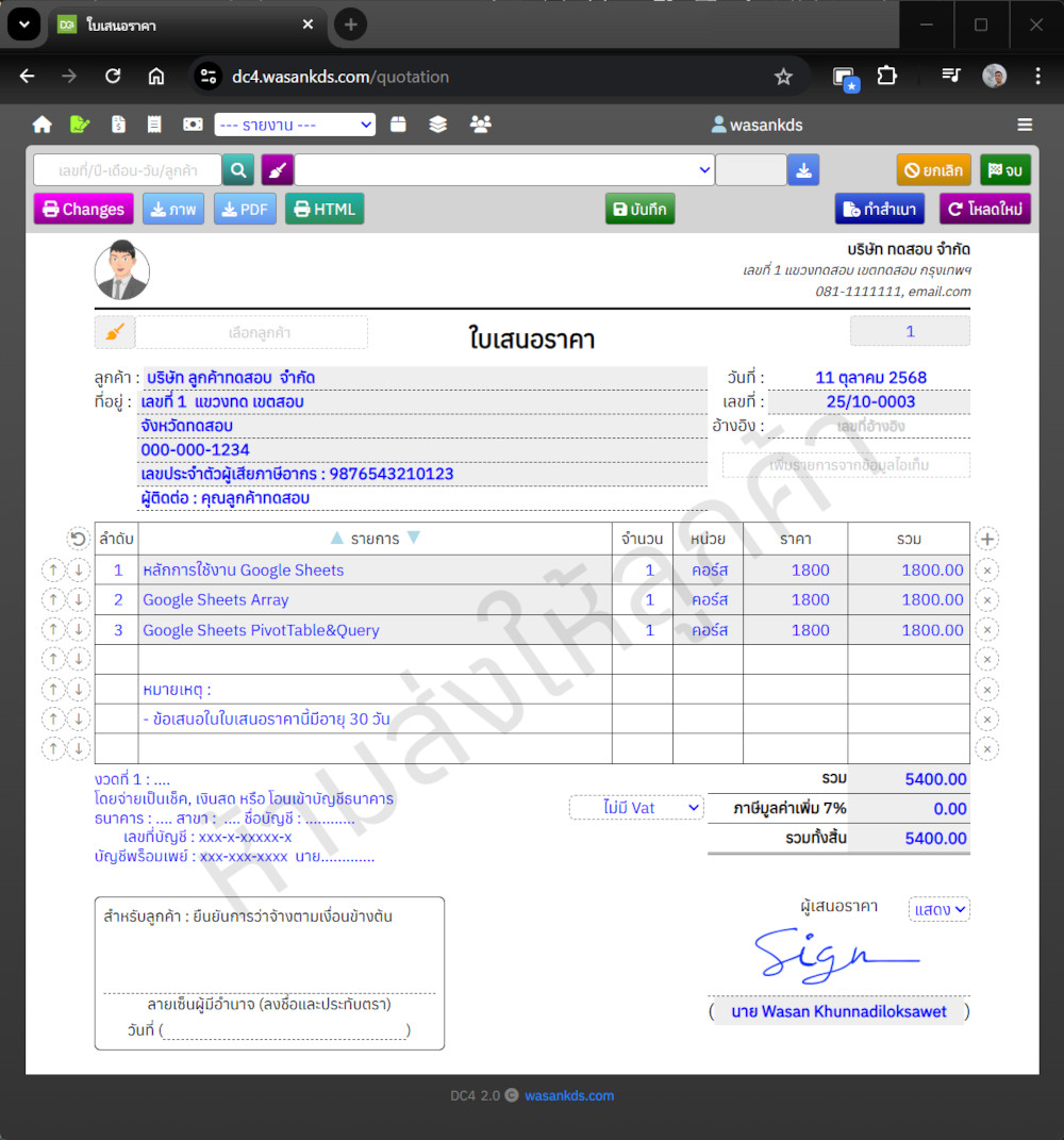 ตัวอย่างการพิมพ์ใบเสนอราคาแบบ HTML เพื่อพิมพ์ลงกระดาษ A4